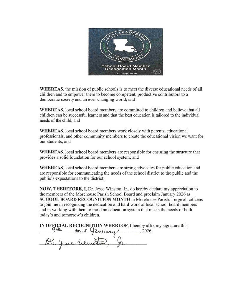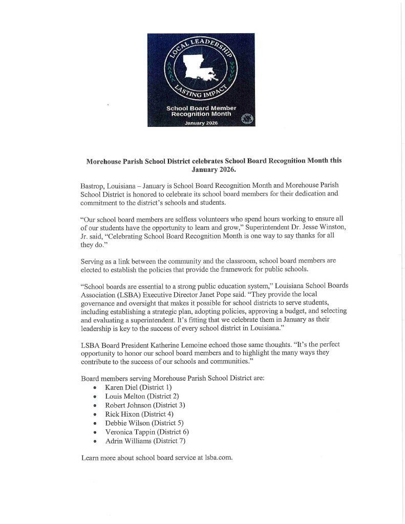The 2025 Millages will be adopted at the May 6, 2025 Morehouse Parish School Board meeting, scheduled for 5:30 P.M.